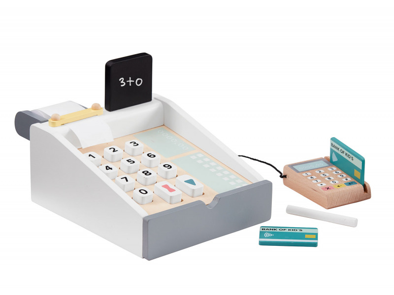 Pokladna v dřevěném provedení je nezbytným doplňkem dětského obchodu. Pokladna je vybavena mačkacími tlačítky s čísly, černou tabulkou s křídou pro psaní ceny, čtečkou platebních karet a zásuvkou na peníze.Pokladna je součástí ucelené kolekce dřevěných hraček Kids Concept Bistro.Rozměry: 26 x 16... przeczytaj całość