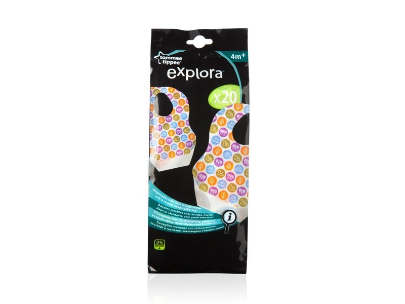 Jednorázové bryndáky Tommee Tippee Explora, výhodné na cestování.Papírovo-polyetylénový s korýtkem. przeczytaj całość
