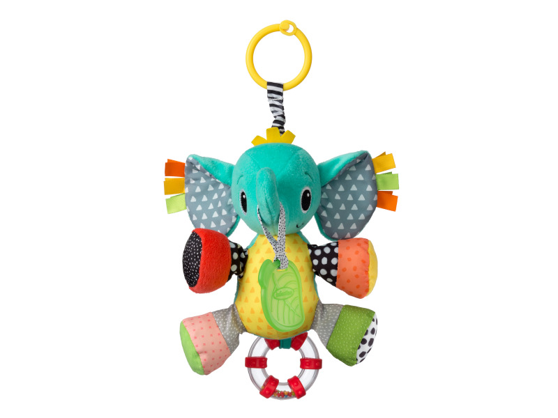 Různobarevný slon upoutá pozornost dítěte svými výraznými barvami i chrastěním při pohybu. Po zatažení za šňůrku vibruje. Různorodé textury lákají dítě ke zkoumání. Kousátko pomáhá dítěti při prořezávání prvních zoubků.Hračku je možné zavěsit na autosedačku, kočárek či hrazdu na hrací dece.Vhodné... przeczytaj całość