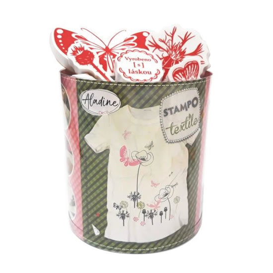 Razítka na textil. Sada obsahuje razítkovací polštářek s textilní barvou. Narazítkované motivy důkladně zažehlete, praní na 40C. Razítka po použití umyjte jemným kartáčkem a vodou. przeczytaj całość