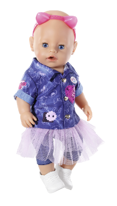 Nastražte kočičí ouška na čelence, právě přichází BABY born ve své nádherné džínové soupravě. Stylová halenka je potištěna veselými motivy a ozdobena knoflíky ve tvaru srdíček. Když pohladíte velké flitrové srdíčko, změní barvu z růžové na fialovou. Pod růžovou vrstvenou tylovou sukýnku si BABY...