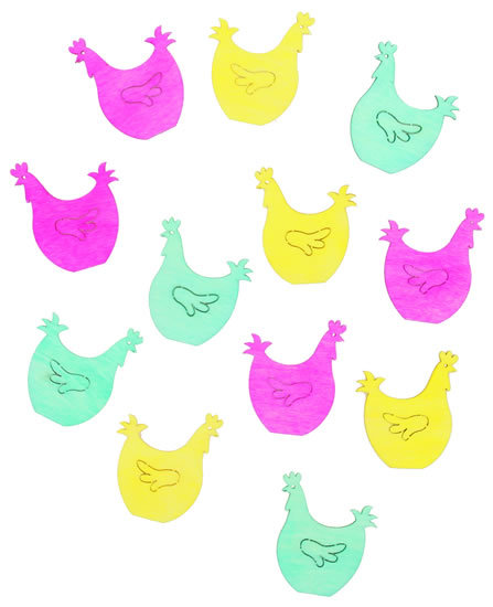 Dřevěné slepičky v pestrých barvách jsou určeny k vytváření dekorací. przeczytaj całość