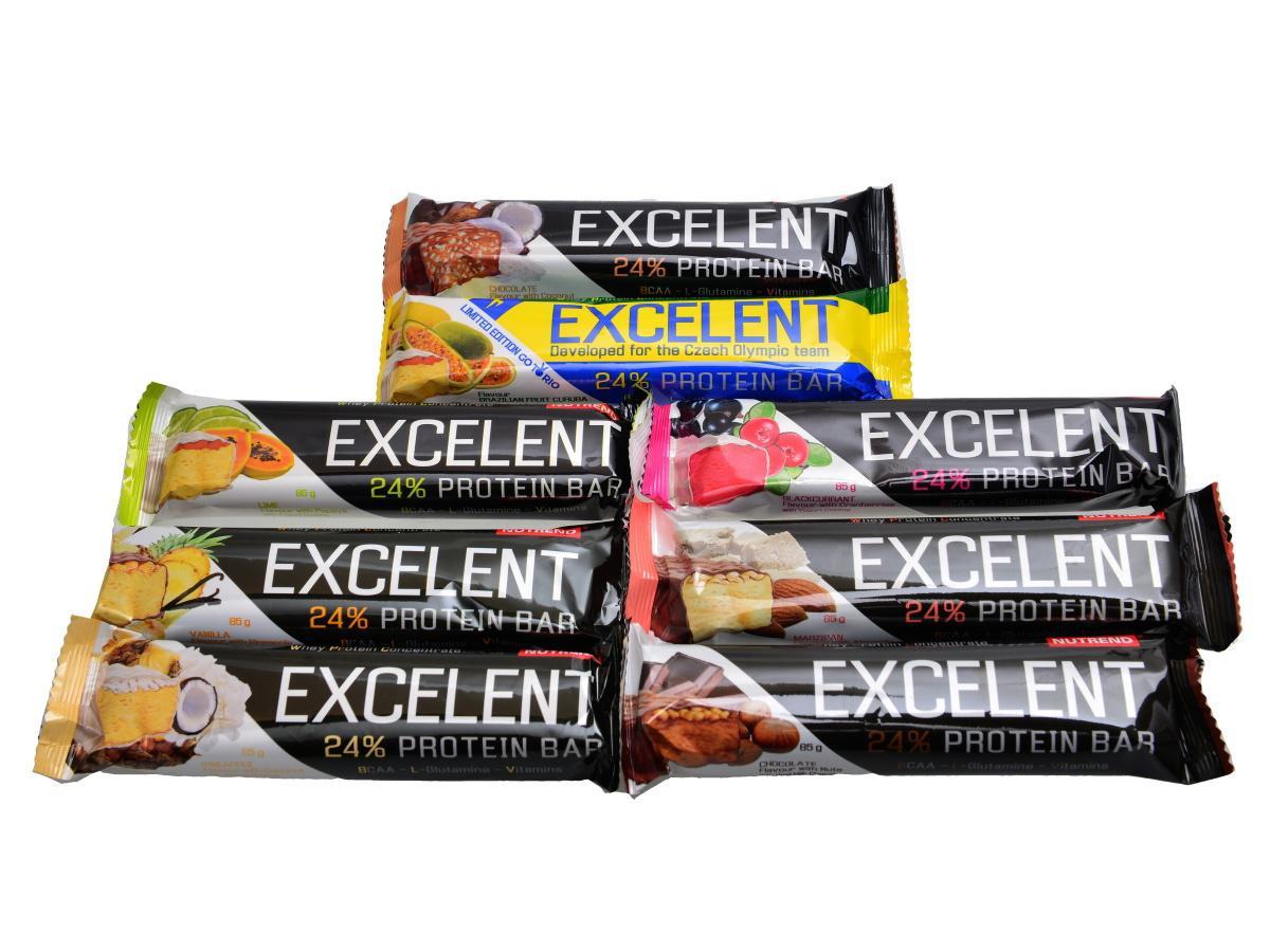 Excelent Protein Bar - Delikátní dvouvrstvá proteinová tyčinka. Excelent Protein bar je tyčinka bohatě posypaná ovocem či oříšky, zalité v čokoládě nebo jogurtové polevě. Excelent Protein bar obsahuje 24% bílkovin a 43% sacharidů. TA CHUŤ TĚ DOSTANE!WHEY PROTEIN CONCENTRATE - SOY PROTEIN ISOLATE...