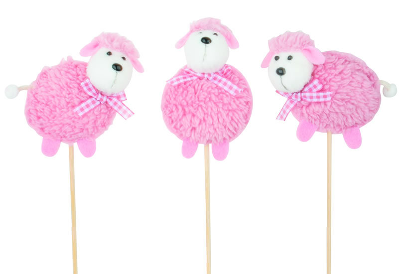 Hebká růžová ovečka na špejli ozdobí květináč nejen o Velikonocích. przeczytaj całość