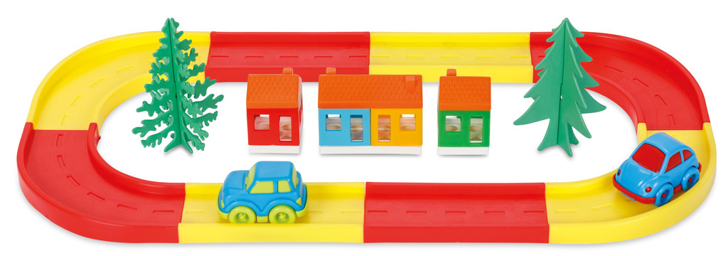 Silnice-autodráha OVÁLNÁ, pravidelný tvar.3 domečky, stromky a součástí balení jsou i 2 autíčka. Rozměry 56 × 57 cm. przeczytaj całość