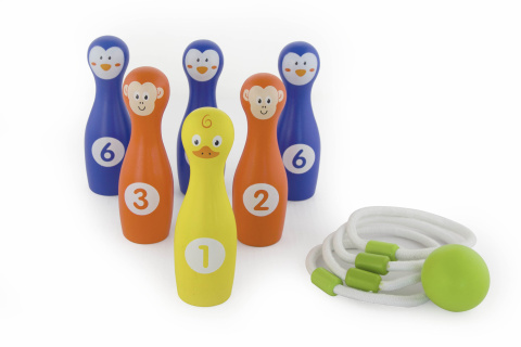 Dřevěná kuželky. Balení obsahuje 6 kuželek, 4 kroužky a jednu kouli. Rozměry balení cca 42,5 x 23 x 5,5 cm. Věk 24m+ przeczytaj całość