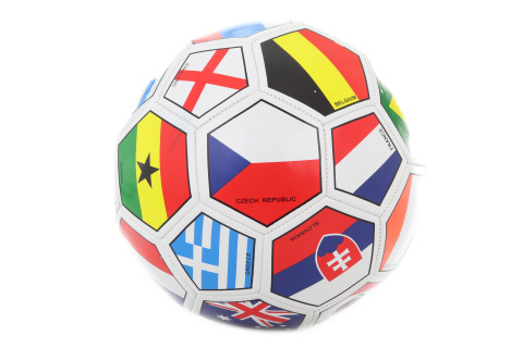 Piłka piłkarska z flagami. Piłka jest dostarczana nienapompowana. Piłka przeznaczona na nawierzchnie nieutwardzone (trawa, ziemia). Średnica napompowanej piłki ok. 20 cm, w zależności od napompowania. Rozmiar piłki to 5. Wiek 3+ przeczytaj całość