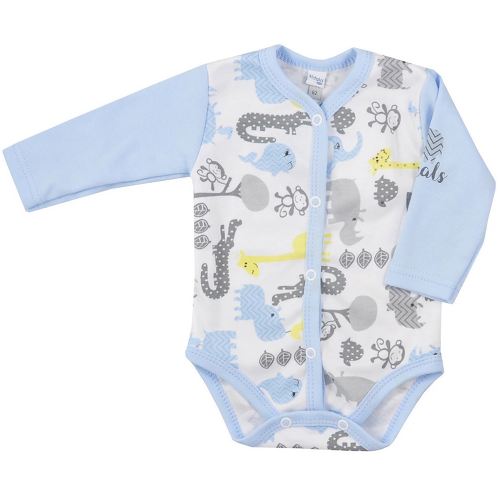 Bavlněné kojenecké body s dlouhým rukávem Koala Animals in ZOO pro miminka. Dětské body je celopotištěné zvířátkami, rukávky jsou jednobarevné a okolo krčku, nožiček a podél celého zapínání má barevný lem. Má krásné zářivé barvy s výrazným a hravým motivem. Praktické zapínání na cvočky po celé délce a mezi nožičkami velmi usnadní oblékání a přebalování. Složení: 100% bavlna.