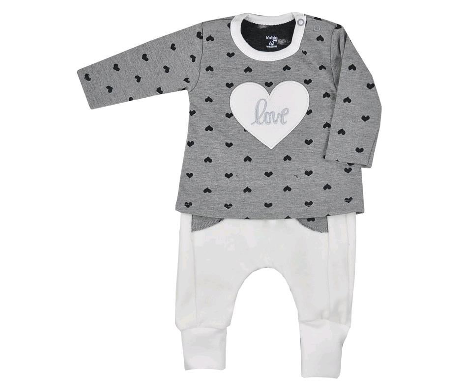 Kojenecké tepláčky a mikinka Koala Jessica. Mikinka má zapínání na cvočky na ramínku, je celopotištěná srdíčkami a je zdobena obrázkem velkého srdíčka s nápisem love. Okolo krčku má lemování. Tepláčky mají na nohavičkách a v pase široký lem a stylový snížený sed. Soupravička má všestranné využití. Materiál: tepláčky: 80% bavlna, 20% polyester, mikinka: 96% bavlna, 4% polyester.