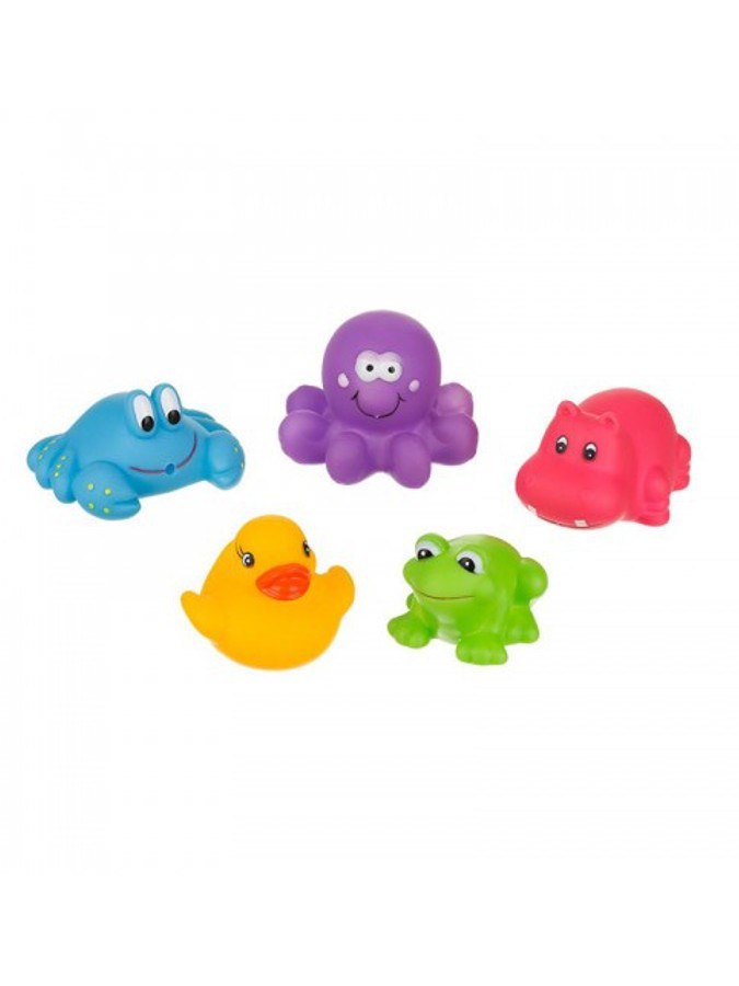 Kolorowe zabawki do kąpieli Akuku. Zestaw 5 uroczych kolorowych zabawek - kaczuszka, żabka, hipcio, krab, ośmiornica. Idealne do zabawy w wannie. Wesołe kolory przyciągają uwagę naszych najmłodszych. Każda zabawka ma otwór, przez który można pryskać wodę. Zaokrąglone kształty zapewniają bezpieczeństwo podczas zabawy. Wykonane z bezpiecznych, wysokiej jakości materiałów, nie zawierają bisfenolu A. Wysokość zabawek 4 do 5 cm.