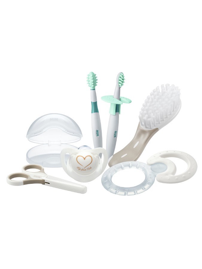 Startovací sada pro miminka Welcome set NUK. Balení obsahuje:- NUK dudlík Genius “My first NUK“ (0-6 měsíců)- NUK box na dudlíky- NUK dětský kartáč s extra měkkými nylonovými štětinami- NUK šetrné dětské nůžky na nehty- NUK Zubní kartáček + Masážní Kartáček s ochranným kroužkem (6+ měsíců)-...