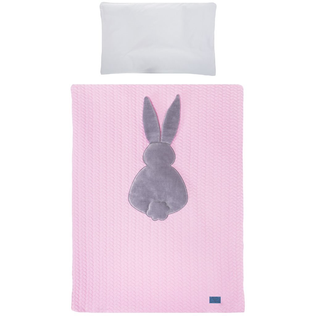 Dětská 3-dílná souprava do postýlky Belisima Králíček. Souprava je z jedné strany z úpletového materiálu zdobena 3D vzorem a roztomilým plyšovým králíčkem. Druhá strana je bavlněná. Je vyrobena z měkkého, příjemného materiálu. Obsahuje povlečení na polštářek cca 40x60 cm, povlečení na peřinku...