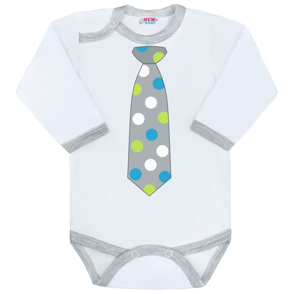 Originální bavlněné kojenecké body s dlouhým rukávem New Baby, s obrázkem puntíkované kravaty. Body má kolem krčku, nožiček a ručiček barevné lemování. Barvy použité k potisku jsou certifikované a vhodné pro miminka. Je vyrobeno z příjemného a kvalitního materiálu, ve kterém se bude Vaše miminko...