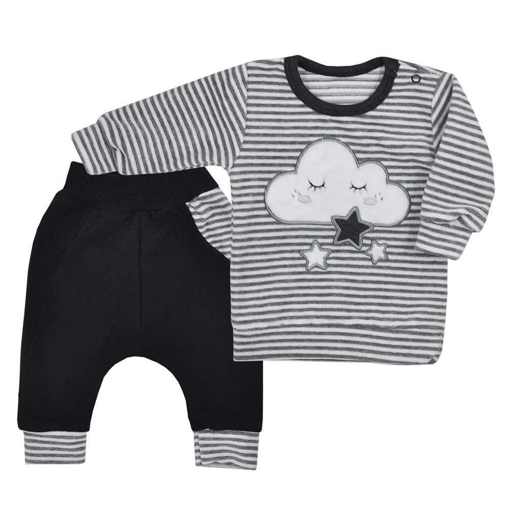 2-dílná semišková souprava Koala Cute Cloud. Součástí soupravičky jsou tepláčky a tričko. Tepláčky mají moderní střih se sníženým sedem. Tričko je zdobeno stále modernímy pruhy a obrázkem roztomilého obláčku. Praktické zapínání na cvočky na ramínku. Soupravička je vyrobená z velmi příjemného a měkkého materiál. Materiál: tepláčky: 96% bavlna, 4% polyester, mikinka: 80% bavlna, 20% polyester.