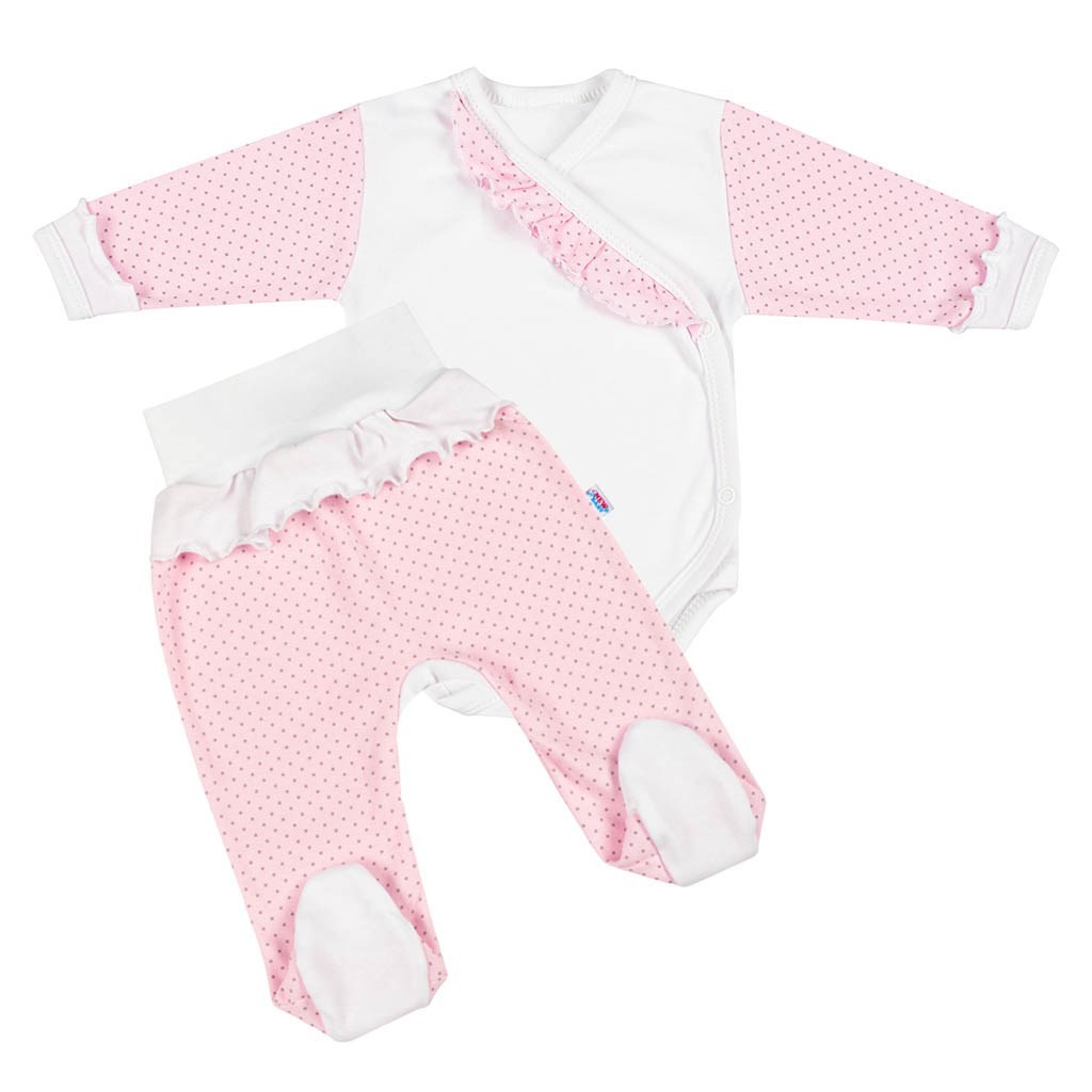 2-dílná bavlněná soupravička New Baby Puntík II s volánky a puntíky. Holčičí soupravička obsahuje polodupačky a body. Body s dlouhým rukávem má zapínání na boční straně a mezi nožičkami na cvočky. Je zdobeno puntíkovými rukávky a roztomilými volánky. Polodupačky mají stahovací pružný lem, který netlačí na bříško miminka a na přední straně kolem pasu roztomilý volánek. Složení 100% bavlna.