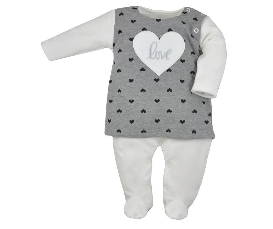 Holčičí kojenecký overal Koala Jessica. Šatičkový střih overálku má zapínání na cvočky na ramínku, pod paží a mezi nožičkami. Vrchní část je celopotištěná srdíčkami a je zdobena obrázkem velkého srdíčka s nápisem love. Spodní část overálku je jednobarevná. Díky overálku při jakémkoliv pohybu...