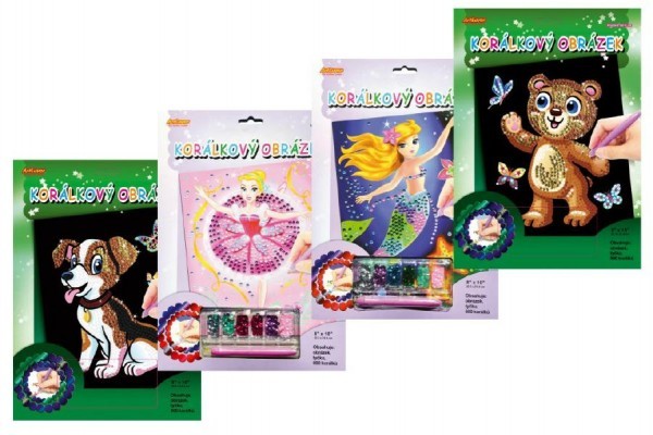 Z obrazka zdejmujesz folię ochronną i w odpowiednie miejsca przyklejasz koraliki, które nakładasz za pomocą patyczka.