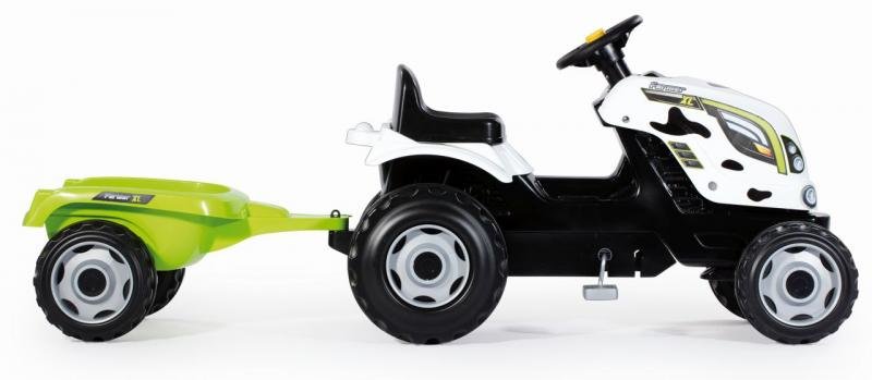 Šlapací traktor s volantem a zeleným přívěsným vozíkem, který lze odpojit. Odklápěcí kryt motoru. Nastavitelné sedadlo dle výšky dítěte. Klakson na volantu. Barevné provedení samotného traktoru ve stylu bílo-černé kravičky. Vyrobeno z velmi kvalitního plastu. Rozměry vč. vozíku: 140,6 x 52,7 x 44 cm. Délka traktoru bez vozíku cca 80 cm. Hmotnost 6,3 kg.