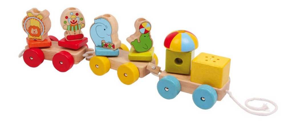 Barvy a roztomilé obrázky na sestavitelných dílech z kvalitního bukového dřeva fascinují děti! Jednotlivé prvky se dají různě nasadit a děti mohou pozorovat, jak se točí, když se vláček táhne - skvělá zábava pro malé fanoušky vlaků. Vagóny se dají připojit pomocí šňůrky a dřevěného kolíku.Německá...
