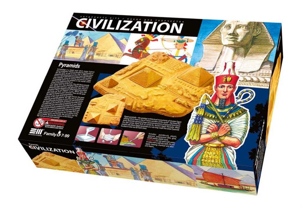 Egyptské pohřebiště – zde bude jako model napodoben jeden ze starověkých divů světa! Sádru (3x 200 g) smíchejte s vodou, vylijte do obsažených forem, masu vyhlaďte a nechte ztuhnout. Pak jednotlivé prvky ozdobte obsaženými 6 barvami, taktéž pomalujte podklad z měkké pěny a pak zafixujte prvky...