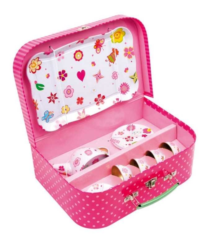 Květinami a motýlky krásně zdobený čajový set se 4 šálky s podšálky, 4 dezertními talířky z lakovaného kovu. Vše prakticky uloženo v pestře zdobeném kufříku s pojistným zámkem a držadlem. V balení je celkem 15 kusů nádobíčka včetně kufříku.Německá firma Legler zaměřená na výrobu kvalitních...