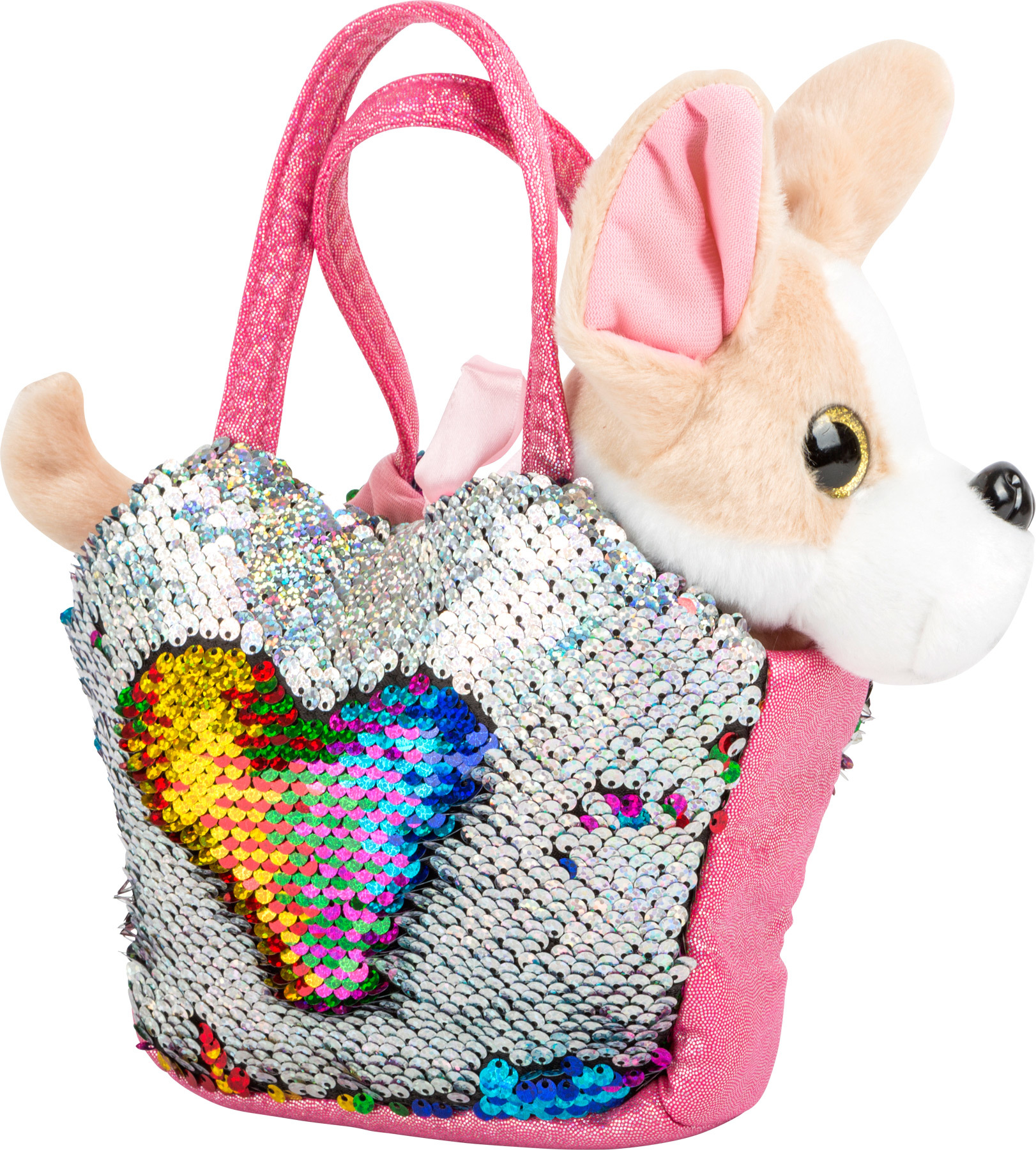 Hej, kdo to vykukuje z té tašky? Tento roztomilý, mazlivý pejsek si našel docela pohodlný pelíšek. Se svýma lesklýma, zlatými očima určitě okouzlí každé dítě. Aby se na cestách zabránilo pádu z kabelky, má pejsek růžový obojek pro svou bezpečnost. Módní flitry na třpytivé kabelce přilákají...