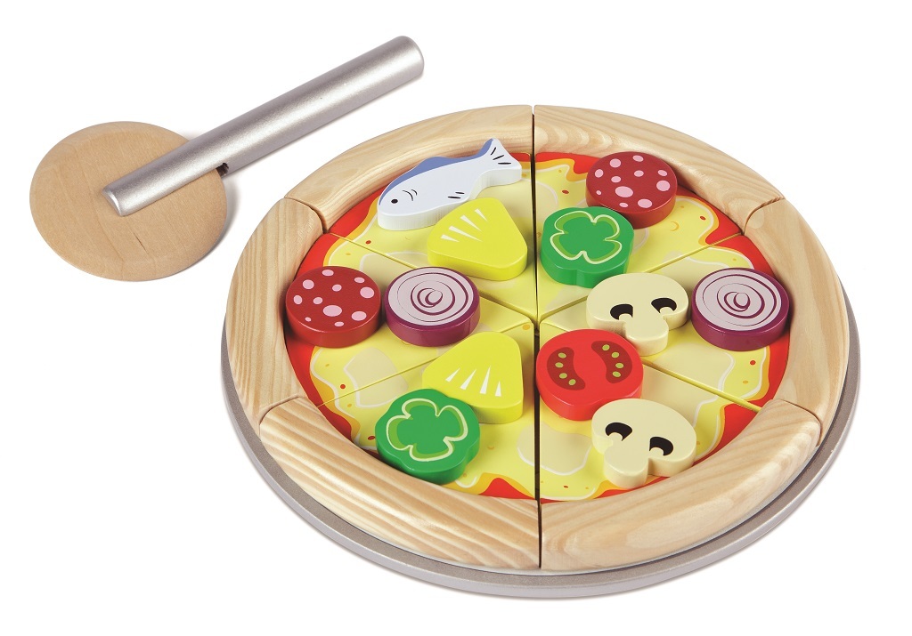 Objednal si někdo pizzu? Herní set s pizzou se skládá z 6 vynikajících plátků pizzy ze dřeva, které obsahují 12 oddělitelných ingrediencí. Vyberte si z těchto ingrediencí a vytvořte pizzu pro přátele a rodinu. Plátky pizzy jsou k sobě připevněny suchým zipem. Jednoduše a bezpečně rozkrojte pizzu...
