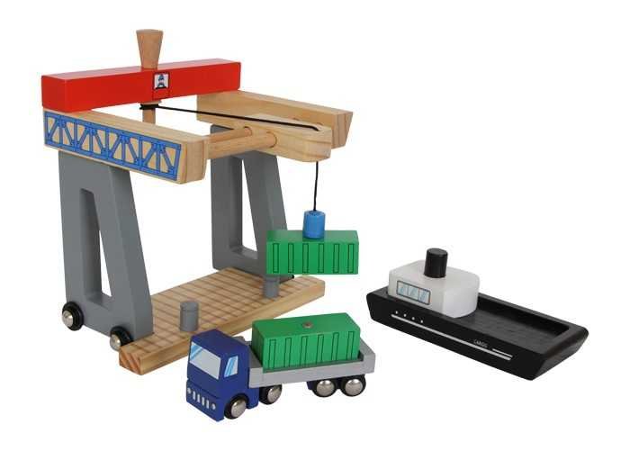 Co dokážou obrovské jeřáby v přístavu v Hamburku, mohou děti zde vyzkoušet s tímto dřevěným kontejnerovým terminálem. K naložení jsou připravená loď a nákladní auto. Magnetické kontejnery lze otáčením osy zvedat a spouštět. Spousta funkci a zábavy pro budoucí manažery přístavů!Německá firma...