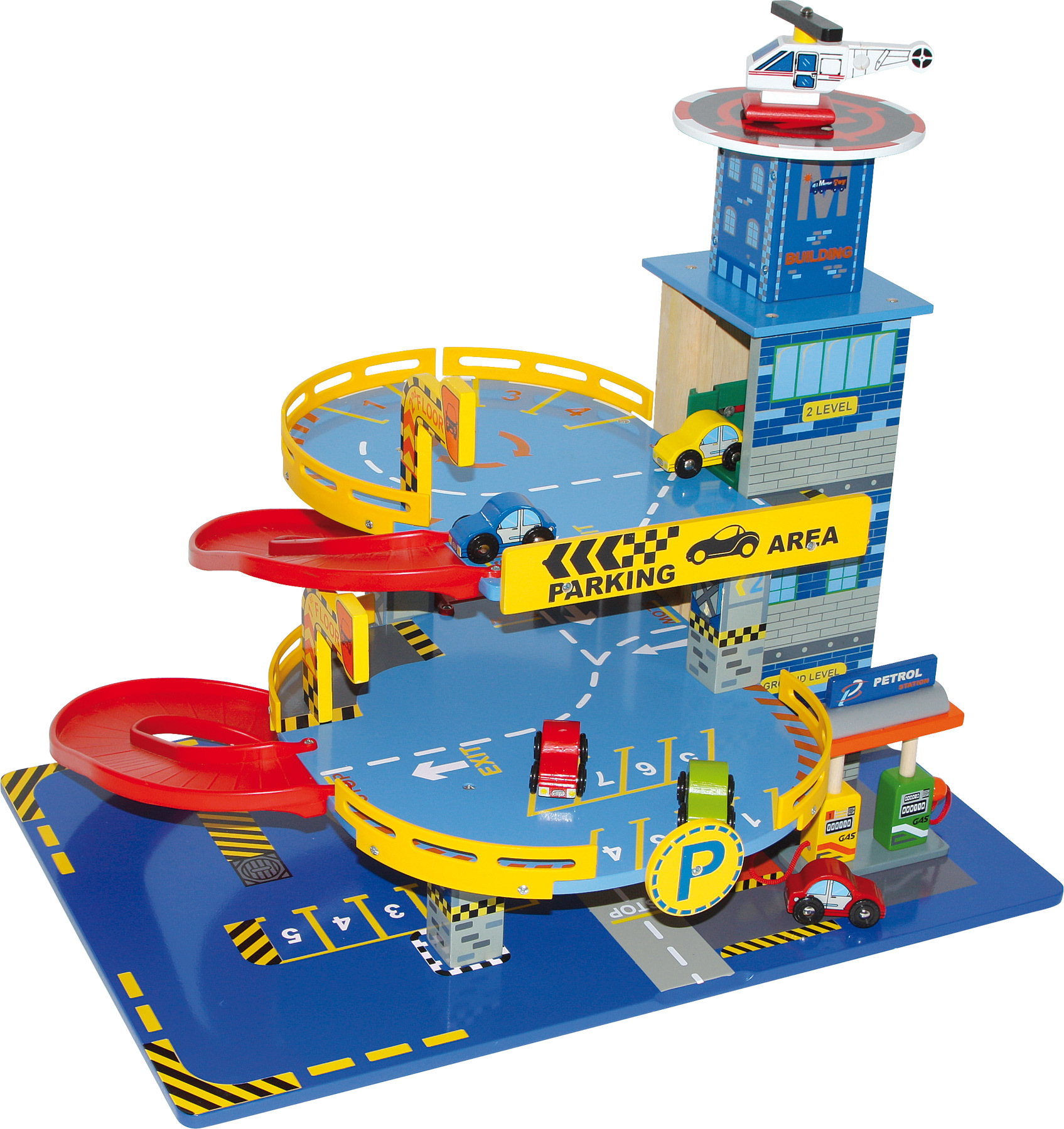 Detailní garáž z barevné lakované překližky. Parkování je možné na 3 různých patrech + je k dispozici přistávací plocha pro vrtulníky a výtah s klikou, který přináší malým řidičům největší zábavu a radost. Příslušenství tvoří autíčka a otočná čerpací stanice.Německá firma Legler zaměřená na...