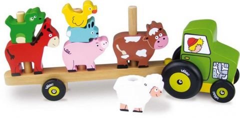 Dřevěná hračka která je nejen traktorem s přívěsem pro zvířátka, ale také nasazovačkou, která trénuje motoriku a zručnost dětí. Děti mohou zvířata libovolně sundat, pohrát si s nimi a pak je opět nasadit na přívěs, s kterým odjedou na jiné místo. Obsahuje šest různých domácích zvířat. Hračky...
