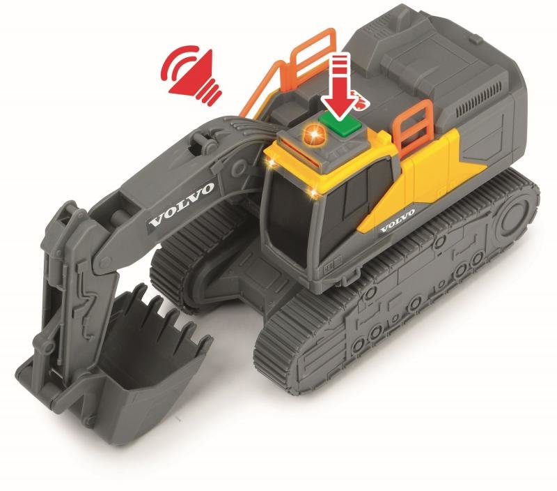 Pásové rypadlo Volvo na volnoběh se světelnými a zvukovými efekty. Pohyblivá lopata a rameno lopaty, otočná kabina. Velikost 23 cm. przeczytaj całość