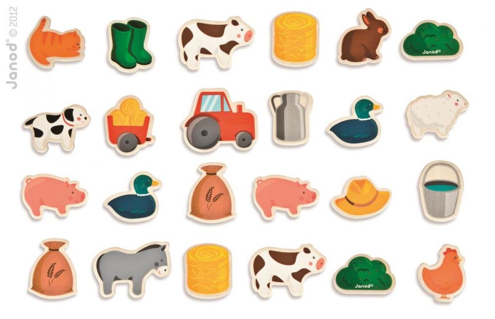 Co się dzieje na farmie? Rozwijaj wyobraźnię dziecka i układaj z nim własne historie za pomocą magnesów z motywami farmy. Ucz się zwierząt i nazw przedmiotów, rozwijaj wyobraźnię przestrzenną i małą motorykę u najmłodszych albo ćwicz zbiory i liczenie ze starszymi dziećmi! Stylowy dodatek na lodówkę lub na jedną z tablic JANOD w pokoju dziecięcym. Zawiera 24 drewniane magnesy oraz praktyczne opakowanie z pętelką do zawieszenia. Nadaje się dla dzieci od 18 miesięcy, wymiary opakowania 14,5 x 8 x 14,5 cm.