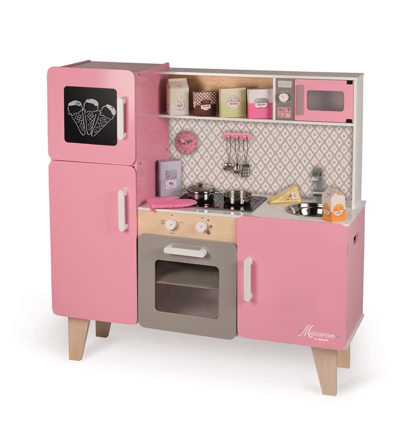 Tomu se řekne pořádná kuchyně pro náročné šéfkuchařů! Součástí velké růžové kuchyňky Macaron Janod je až 15 doplňků, včetně chňapky, hrnců, lopatky a naběračky, potraviny zabalené v dřevěných krabičkách a volské oko. Vestavěnou součástí kuchyňky je polička, hodiny, věšák na vařečky, mikrovlnka,...
