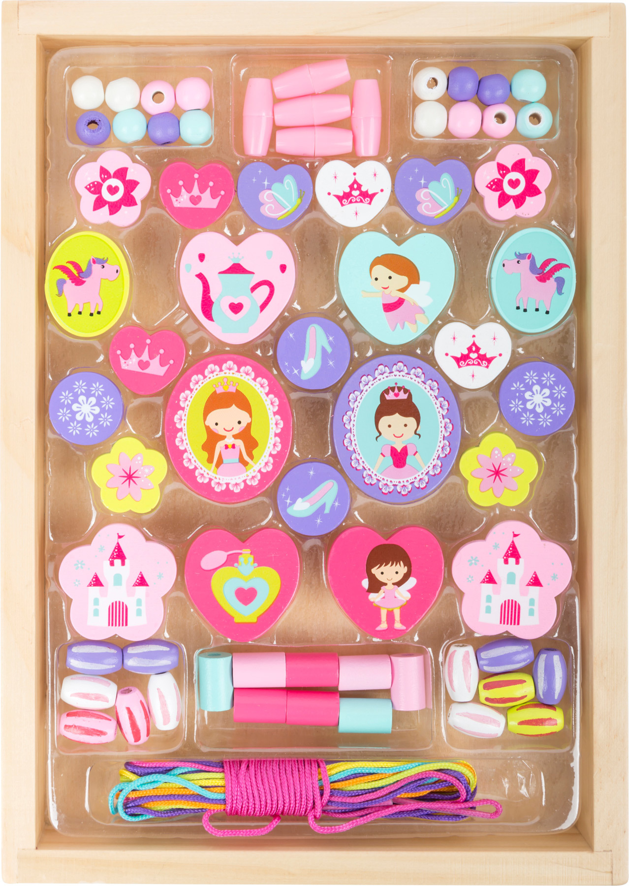Kreativní sada je vyrobena ze dřeva z odpovědných zdrojů. Sada na navlékání obsahuje barevné šňůrky, dřevěné korálky a přívěsky s motivy jednorožců a princezen. Všechny korálky jsou uloženy v praktické dřevěné krabičce.