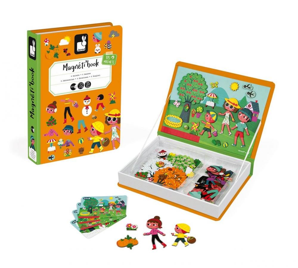 Magnetyczna książka Magneti'Book Cztery Pory Roku to piękna zabawka odpowiednia dla dzieci od 3 do 8 lat. Magnetyczna układanka w kształcie książki ma kolorowy motyw, który przyciąga uwagę dzieci. Zajmij swoje dzieci układaniem obrazków z magnetycznych elementów według wzoru. Dzieci zgadują pory roku i układają scenariusz tej pory roku z odpowiednim ubraniem i dodatkami. Magnetyczna zabawka zawiera 4 kartoniki z wzorami i 115 magnetycznych elementów. Praktyczne opakowanie zapewnia wygodne przenoszenie zabawki, dzieci bawią się nią nie tylko w domu, ale także podczas długich podróży. Magnetyczna książka dla dzieci to piękna, ponadczasowa zabawka dla każdego dziecka, która spodoba się kilku pokoleniom, wykonana z wysokiej jakości materiałów i nietoksycznych farb. Materiał: karton, magnes Wymiary: 19 x 4 x 26 cm.