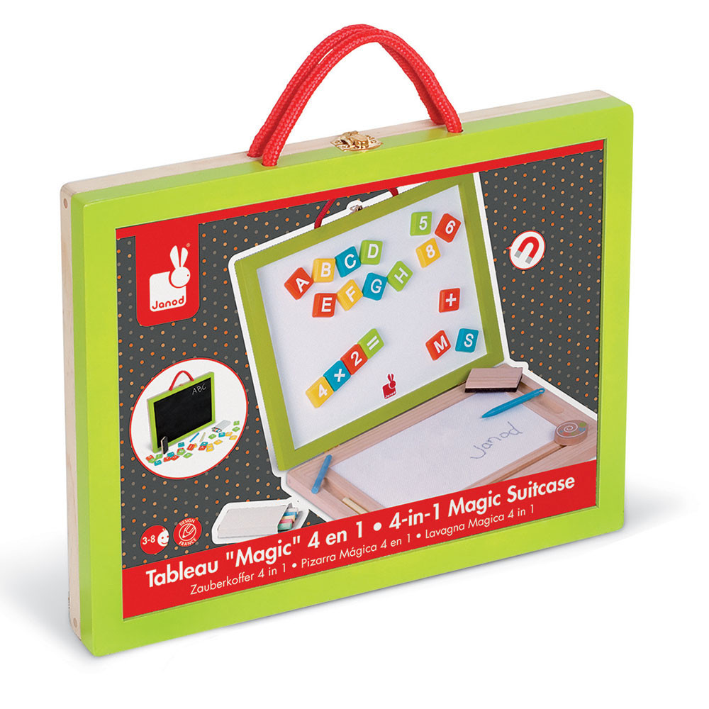 Dřevěný kufřík 4v1 Janod s magnetickou tabulí a 44 doplňky od 3-8 let