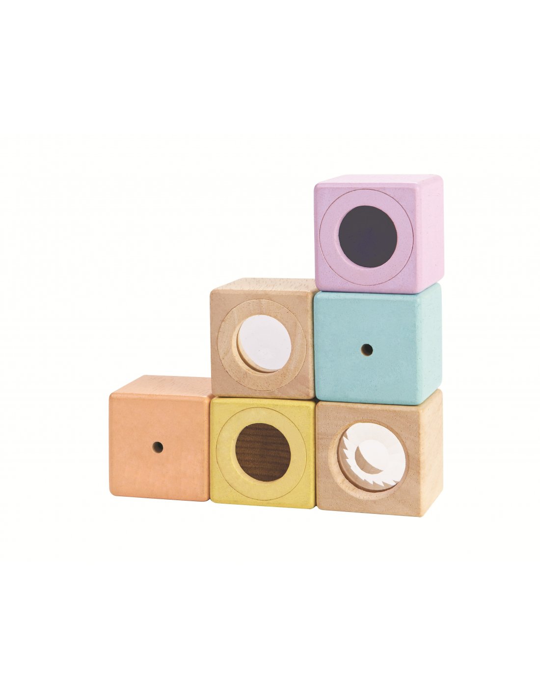 Tato sada 6 smyslových kostek obsahuje: 2 zrakové kostky, 2 sluchové kostky a 2 strukturované kostky.