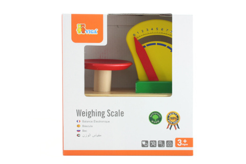 Dřevěná váha o rozměru cca 18,5 x 20 x 8,5 cm. Váha po stisknutí vážícího talířku ukazuje čísla. Rozměry balení cca 20 x 21,5 x 9,5 cm. Věk 3+ przeczytaj całość