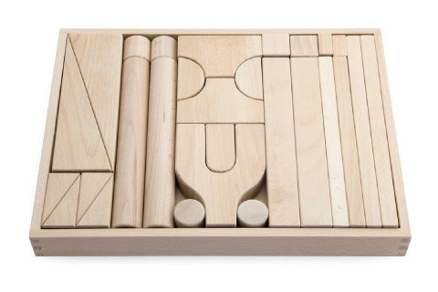 Dřevěná sada kostek na dřevěném podnosu. Rozměry sady cca 39,5 x 29,5 x 4 cm. Věk 24m+ przeczytaj całość