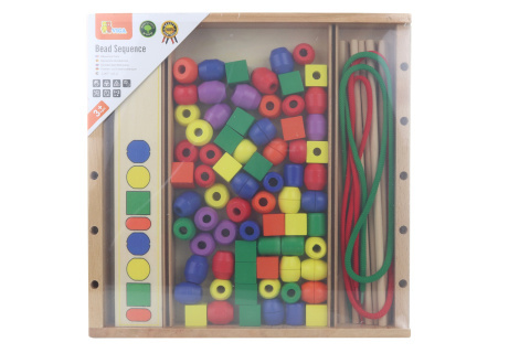 Duży zestaw drewnianych koralików. Opakowanie zawiera koraliki w różnych kolorach i kształtach, patyczki i sznurki do nawlekania oraz wzory, według których dziecko ma nawlekać koraliki. Wymiary opakowania ok. 33 x 33 x 4 cm. Wiek 3+ przeczytaj całość