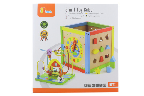 Dřevěná kostka 5v1. Obsahuje labyrint s domácími zvířátky, hodiny, vkládačku tvarů, tabuli na křídy a bludiště. Rozměry kostky cca 30 x 30 x 55 cm. Rozměry balení cca 33 x 33 x 34,5 cm. Věk 18m+ przeczytaj całość