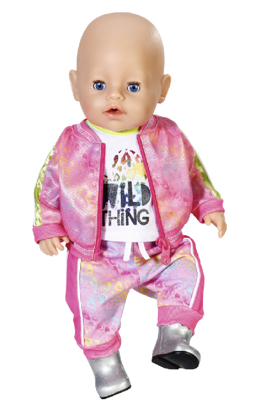 Teplákové soupravy jsou právě teď v módní džungli to největší šílenství. BABY born má obzvláště trendy verzi s barevným leopardím potiskem. Bunda na zip je ozdobena žlutými proužky na rukávech. Leopardí potisk je až za mřížkou, známou také jako tyl. Růžové manžety a proužky najdete také na...