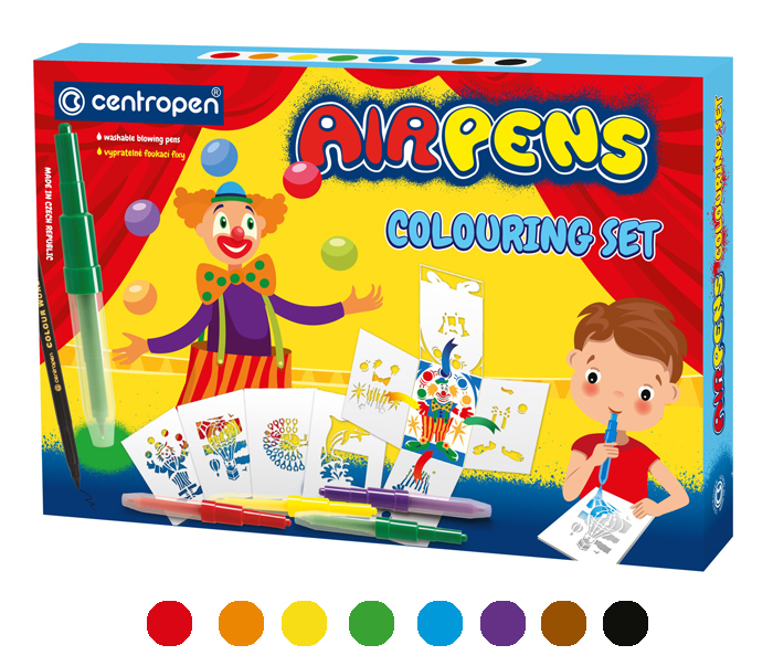 Zestaw pisaków dmuchanych z wkładem, przeznaczonych do papieru. Wkłady zawierają nieszkodliwy dla zdrowia tusz, łatwy do zmywania i prania. Osłona wentylacyjna; po użyciu należy ją dokładnie zamknąć. Opakowanie zawiera 8 sztuk pisaków dmuchanych, 8 szablonów o różnych wzorach, 10 arkuszy A4, 10 arkuszy A5, 6 kartek z narysowanymi motywami oraz czarny pisak. Mix kolorów