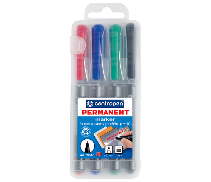 Sada univerzálních permanentních popisovačů, píšících na většinu povrchů. Jsou vhodné k psaní na papír, pryž, kůži, plast, beton, kámen, dřevo, film, fólie, kov, sklo, porcelán. Permanentní, otěruvzdorný inkoust na alkoholové bázi, odolný vodě a teplotě do 100°C, ventilační chránítko. Barva:... przeczytaj całość