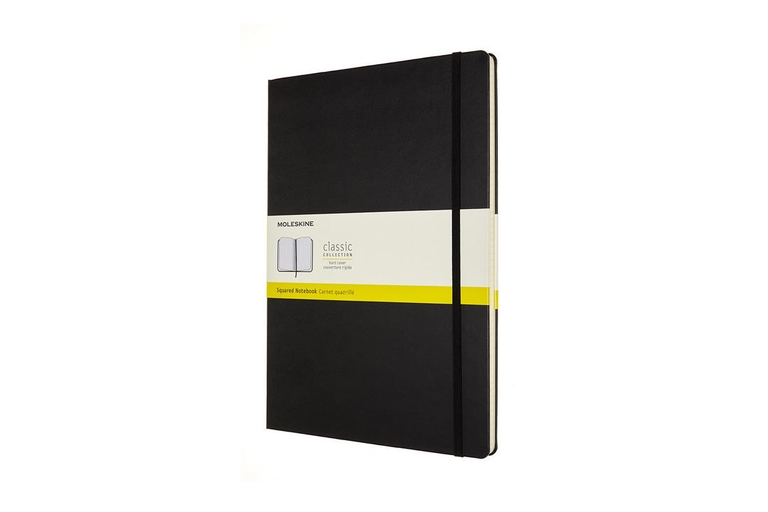 Čtverečkovaný zápisník velikosti A4 v tvrdé vazbě. Obepíná ho pružná páska proti samovolnému otevírání. Každý zápisník je vybaven pořadačem poznámek, který je vyroben z tkaniny a kartonu, textilní záložkou a letákem s historií Moleskine. Papír s gramáží 70 g/m2 neobsahuje kyseliny. przeczytaj całość