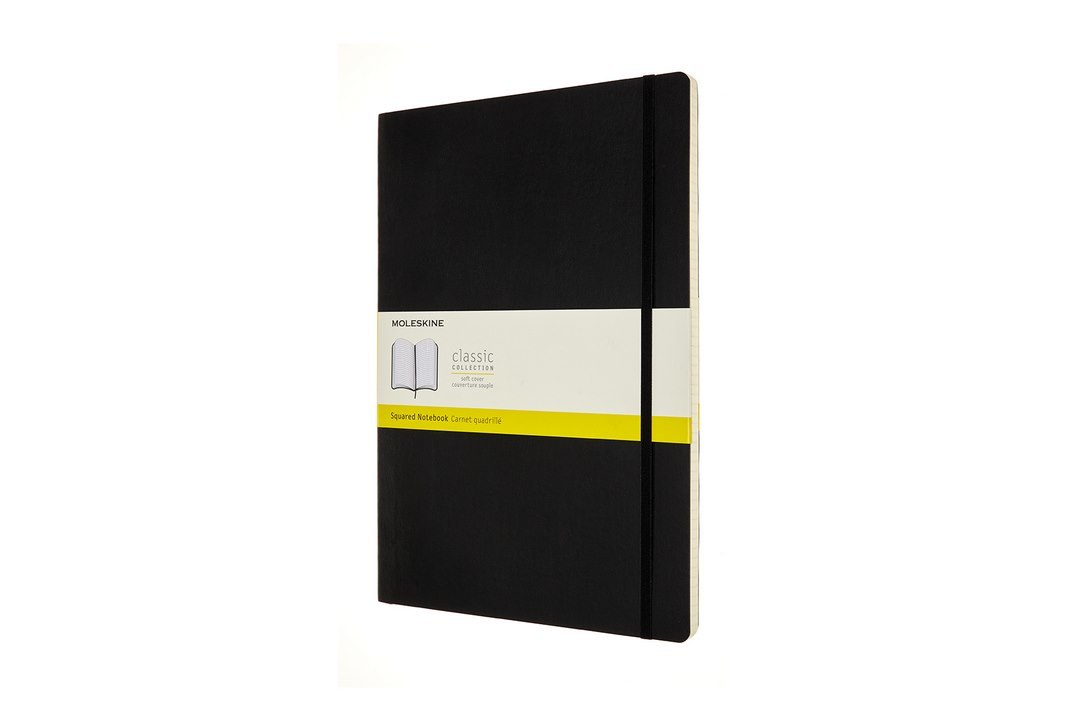 Čtverečkovaný zápisník velikosti A4 v měkké vazbě. Obepíná ho pružná páska proti samovolnému otevírání. Každý zápisník je vybaven pořadačem poznámek, který je vyroben z tkaniny a kartonu, textilní záložkou a letákem s historií Moleskine. Papír s gramáží 70 g/m2 neobsahuje kyseliny. przeczytaj całość