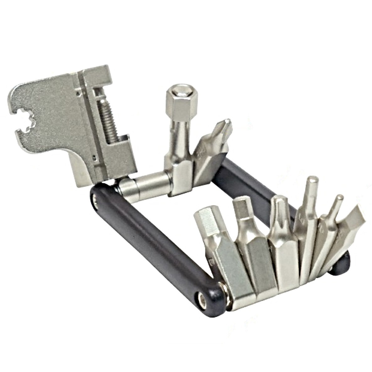 Skladná sada 16 ti kusů nářadí pro rychlé opravy nebo nastavení vašeho kola. Obsahuje nejčastěji používané klíče typu inbus, torx, křížový a plochý šroubovák. Součástí je též kříž pro napínání drátů výpletu kola a nýtovač řetězu.