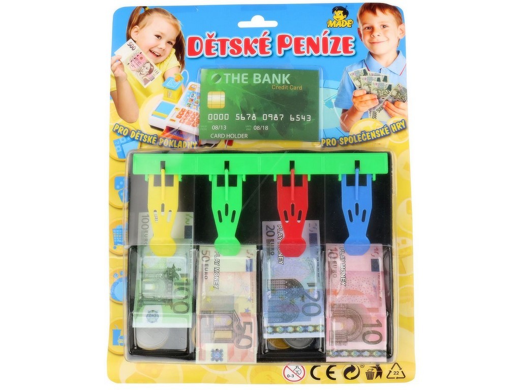 Pokladna s penězi - EuroHračka je určena pro děti 3+.Rozměr pokladny je 19 cm.Materiál hračky je plast.Pokladna ovsahuje hrací Euro bankovky a mince. przeczytaj całość