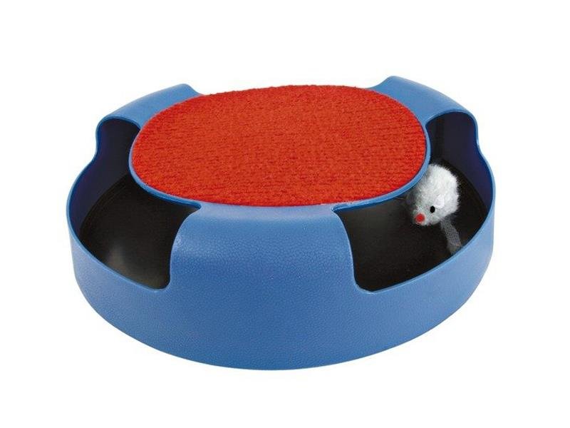 Ta interaktywna zabawka łączy ruch i drapak w jednym. Pluszowa myszka jest przymocowana do pręta wewnątrz plastikowego koła, a kiedy kot próbuje ją złapać, mysz porusza się po obwodzie koła, co pobudza dalszą aktywność łowiecką. W komplecie znajduje się także drapakowy dywanik, który służy do ścierania pazurków - idealny pomocnik do utrzymania zdrowych pazurów i jednoczesnej zabawy.
