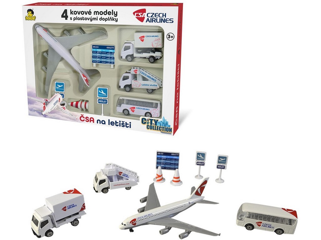 Sada čtyř kovových modelů s plastovými doplňky v barvách a s logem letecké společnosti Czech Airlines. Sada obsahuje autobus, cateringový vůz, pojízné schůdky a model letadla. Součástí jsou plastové tabule s nápisy a vytyčovací kužele.ČSA na letišti v produktové řadě City Collection je vhodné pro... przeczytaj całość
